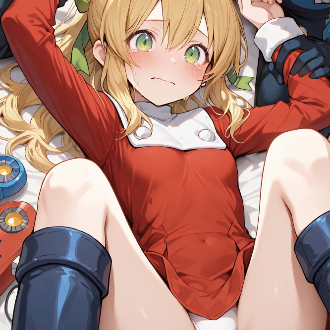 傑作,パーフェクト・アナトミー,高解像度, 非常に詳細な,美しい詳細な目,ダッチアングル,馬鹿げた,r0ll, roll ( メガマン ),ロングヘアー, 金髪, ヘアリボン, ポニーテール, サイドロック, 緑の目, 赤いドレス, ニーブーツ, 長袖,白いパンティ,blush,すすり泣く,波打つ口, 口を開ける,ギャングバング,1girl,寝てる,(アームアップ),足を広げる,膝を上げて, BREAK (1人の男の子,左の手首をつかむ), BREAK (1人の男の子,右の手首をつかむ), BREAK (1人の男の子,膝の上の手 ),