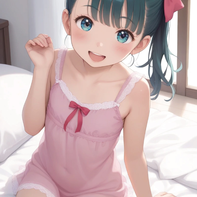 最高画質、 きれいな目、詳細な目 、かわいい顔、赤ちゃんのような顔、笑っている、スマイル、女の子、10歳の女の子、フラットチェスト、ダークヘア、ナイトガウン、頬を引き立てるかわいいリボン、ポニーテール、ブルマ、 ダンス、ベビードールを着た貧乳美少女、とても小さなおっぱい、小学生の女の子