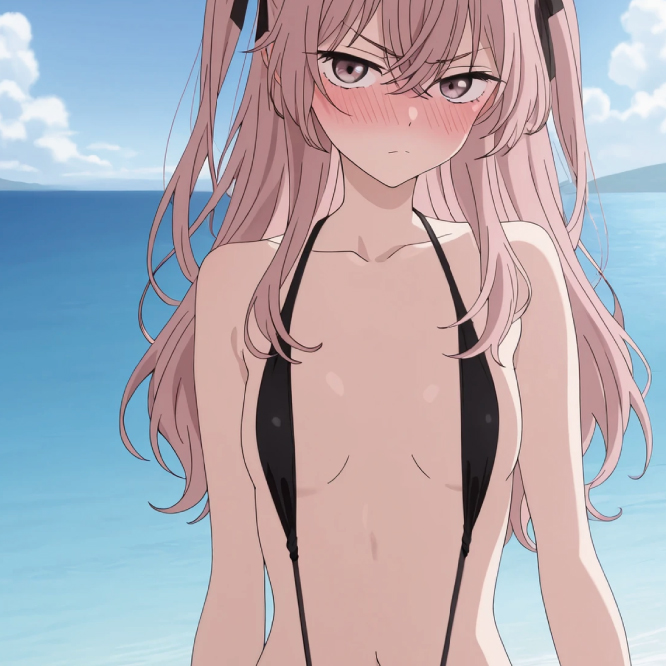 nsfw, 傑作, 最高品質, 8k, 高解像度, 公式アート, アニメスタイル, デジタルペインティング, セルシェーディング, ソフトシェーディング, 詳細な照明, 1girl, ソロ, サジュナが入ってきた, 海に浮かぶ乾さゆな, ロングヘアー, bang, 髪飾り, 夜空の中で, ピンクヘア, 髪の花, ピンクアイ, ツーサイドアップ, crossed bang, 黒い花, ブラックローズ, 成熟した女性, 小さい胸, 睨む, 視聴者を赤面させるほどの全面的なブラッシュ (スリングショットスイムスーツ:1.5), (ヌード:1.5),(露出された臍:1.2),目尻 夏, 日, 日光, 屋外, ビーチ 上半身を濡らすソフトシャドウ, 居心地の良い、親密な雰囲気、柔らかな影,
