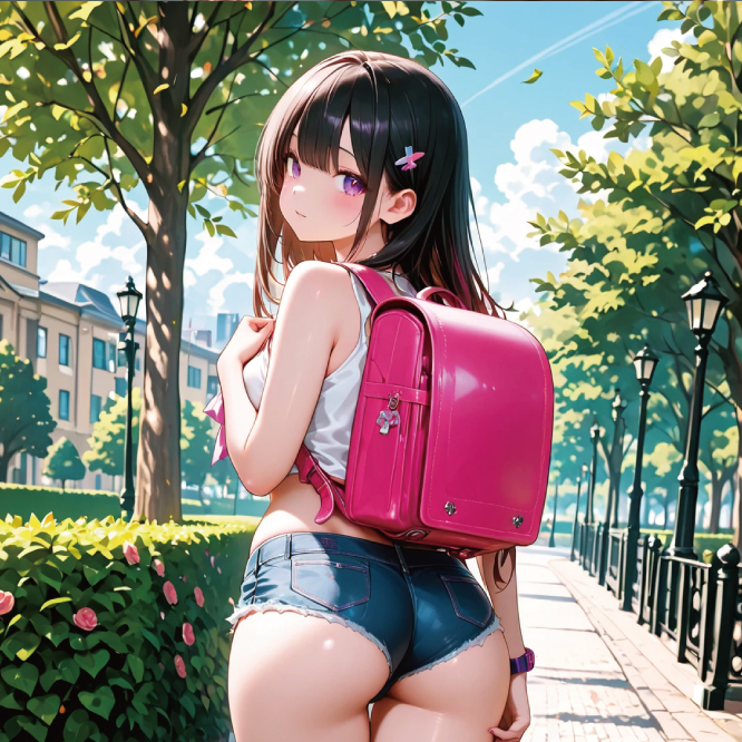 ランドセルを背負ったムチムチのおしりがホットパンツからはみ出している美尻の美少女