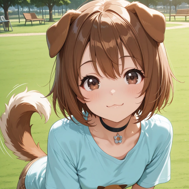 source_anime, masterpiece, best quality, one young adult woman, solo, looking at viewer, beautiful eyes, smile, :3, (brown short hair), dark brown eyes, dog ears, one dog tail, swinging the tail, one choker, small breast, t-shirt, short pants, leaning forward, in the grass park, sunny, motion lines, holding a ball
